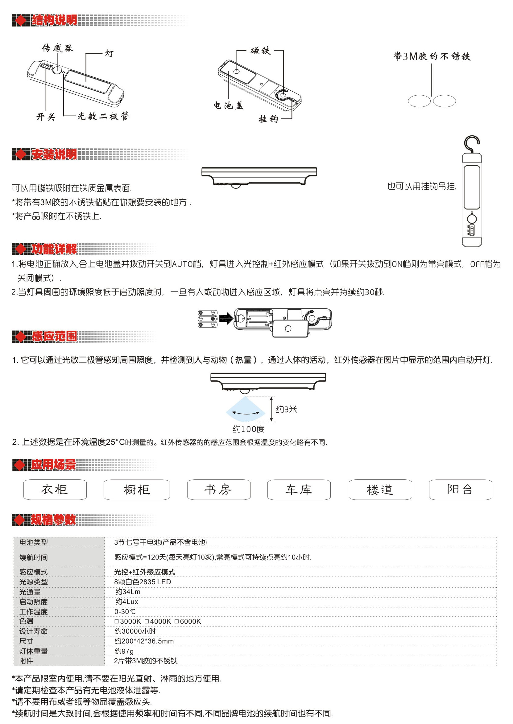6.續(xù)航時(shí)間:感應(yīng)模式=120天 (每天亮燈10次) ,常亮模式可持續(xù)點(diǎn)亮10小時(shí).
