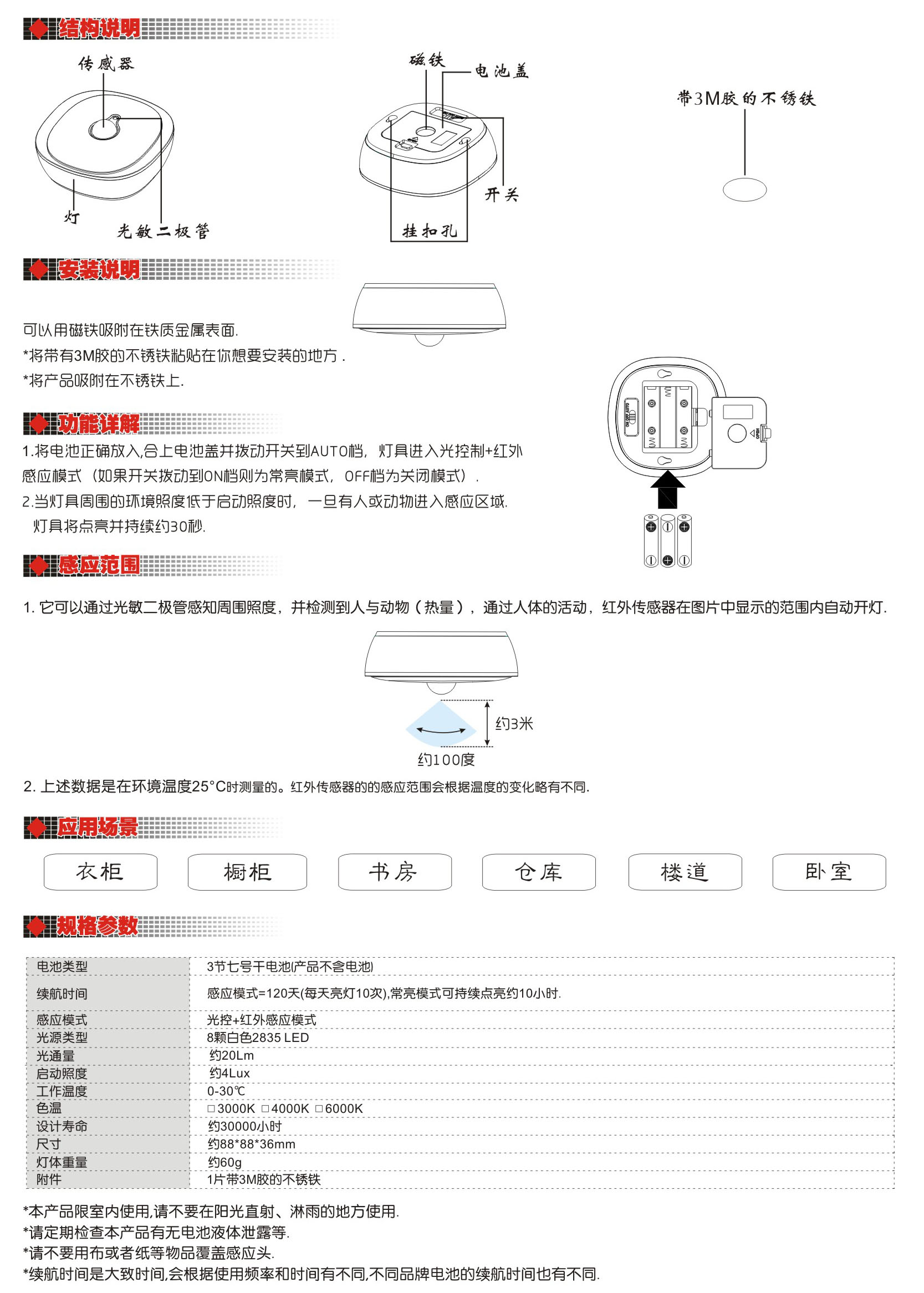 6.續(xù)航時(shí)間:感應(yīng)模式=120天 (每天亮燈10次) ,常亮模式可持續(xù)點(diǎn)亮10小時(shí).